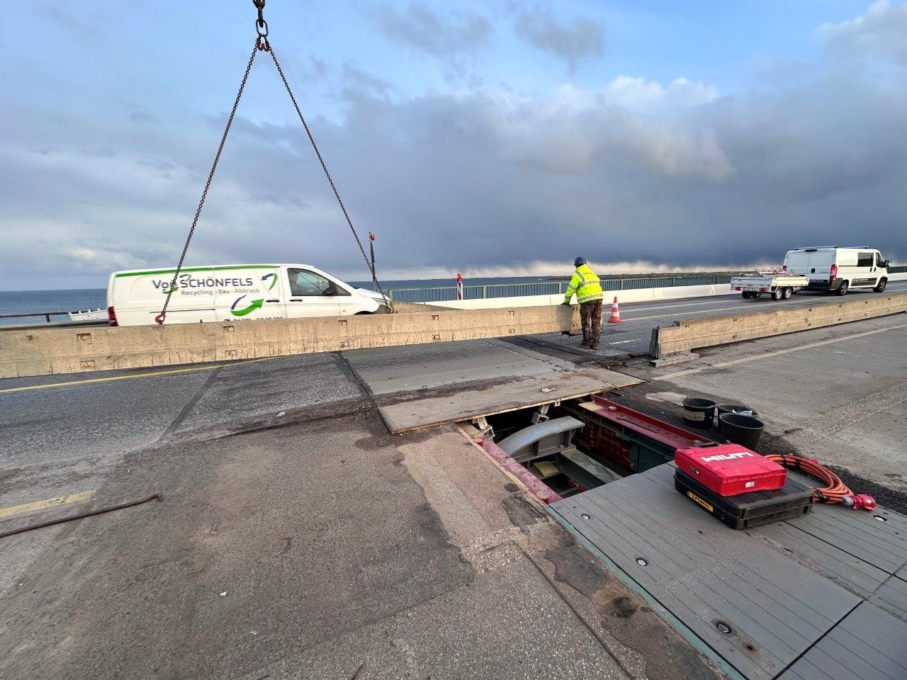 Es freut uns, Ihnen mitteilen zu können, dass der erste Teil der Bauarbeiten am Fahrbahnübergang der Fehmarnsundbrücke früher fertiggestellt werden konnte als geplant.