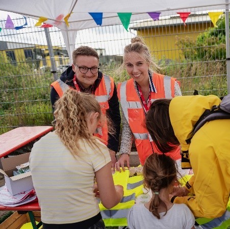 Während sich die Kinder in der eigens eingerichteten Bastelecke im zukünftigen Besprechungsraum kreativ austobten, konnten sich alle anderen bei den DB-Mitarbeitenden an interaktiven Bildschirmen über die aktuelle Planung informieren und einen Überblick zu den Bauarbeiten mit nach Hause nehmen. Auf der Aussichtsplattform erläuterten die Mitarbeitenden der DB und den beteiligten Baufirmen mit bestem Blick über die Baustelle am Gleisdreieck die Herausforderungen der einzelnen Bauphasen.