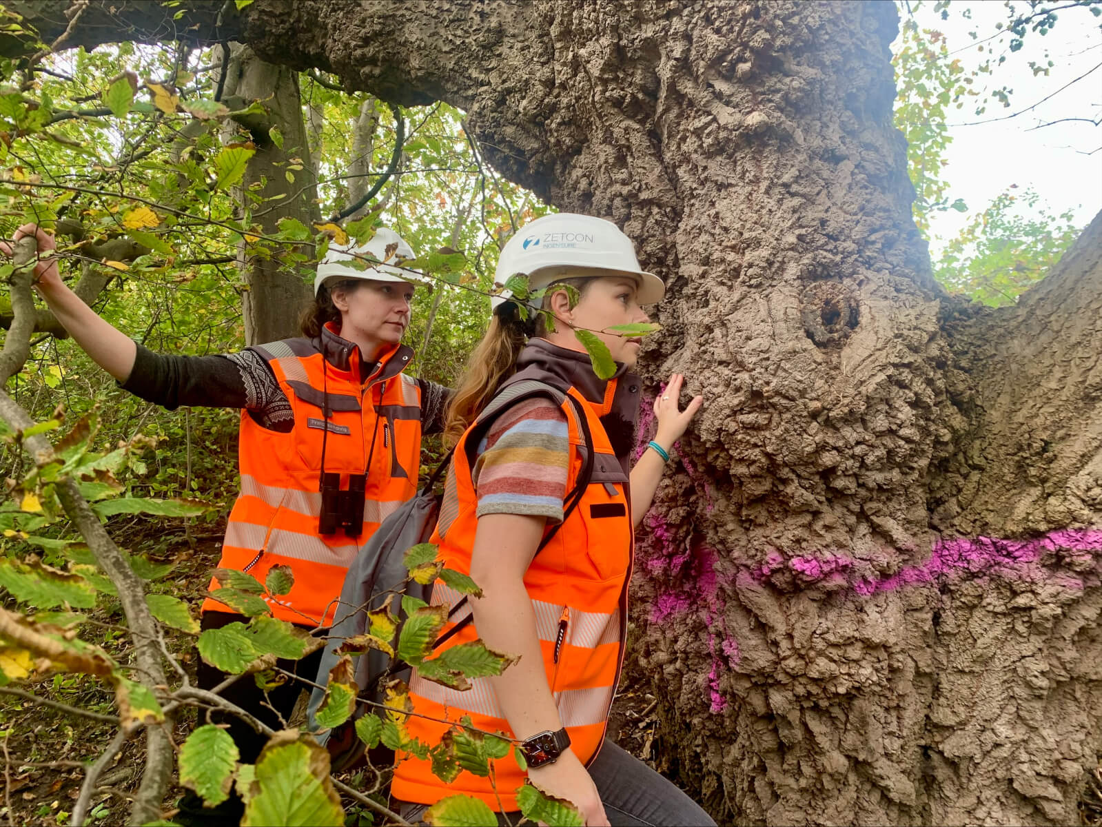 Zwei der Fachkräfte haben dabei eine besondere Aufgabe: Sie begleiten die Rodungsarbeiten und kontrollieren Bäume, Gehölze, Büsche und Baumhöhlen auf Tiere, z.B. Fledermäuse und Nester von Brutvögeln. Dafür begutachten die Bauüberwacher:innen die Bäume u.a. mit einem Fernglas und Endoskop. Sind keine Tiere darin versteckt, werden die Baumhöhlen mit Jute verschlossen. Danach wird das Gehölz freigegeben, welches dann innerhalb von fünf Tagen gerodet werden muss.