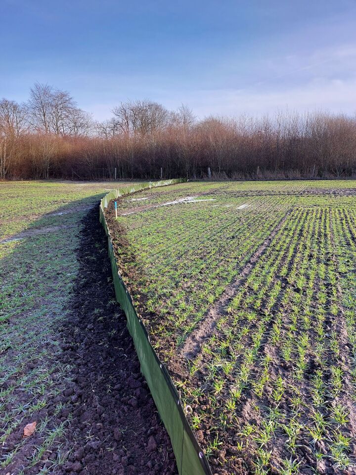 Untersuchungen haben ergeben, dass die Bahnböschungen auf Fehmarn ein beliebtes potenzielles Winterhabitat für den Kammmolch darstellen. Die Böschungen werden jedoch im Rahmen des zweigleisigen Ausbaus auf der Insel überbaut. Um die Amphibien vor den Bauarbeiten zu schützen und ihnen weiterhin einen sicheren Lebensraum zu bieten, haben wir im Frühjahr 2023 einen rund 6 km langen Amphibienschutzzaun entlang der Trasse errichtet. Denn: Wie viele andere Amphibienarten verbringt der Kammmolch die Wintermonate außerhalb seines Laichgewässers und macht sich im Frühjahr auf den Weg zurück zu seinem Laichgewässer. Er wandert also von seinem potenziellen Winterhabitat in der Bahnböschung zurück zu seinem Laichgewässer außerhalb der Bahnböschung. Der Amphibienschutzzaun hält die Kammmolche nun bei der Abwanderung auf und leitet sie in Eimer, die in regelmäßigen Abständen am Fuße des Zauns eingegraben wurden. Mitarbeitende der Firma Claus Rodenberg Forst- und Landschaftspflege überprüfen die Eimer täglich und dokumentieren die gesammelten Tierchen. Anschließend bringen sie die Amphibien zu sicheren und in der Nähe liegenden Laichgewässern. Das Büro AFRY aus Schwerin überwacht die artenschutzrechtliche Maßnahme.