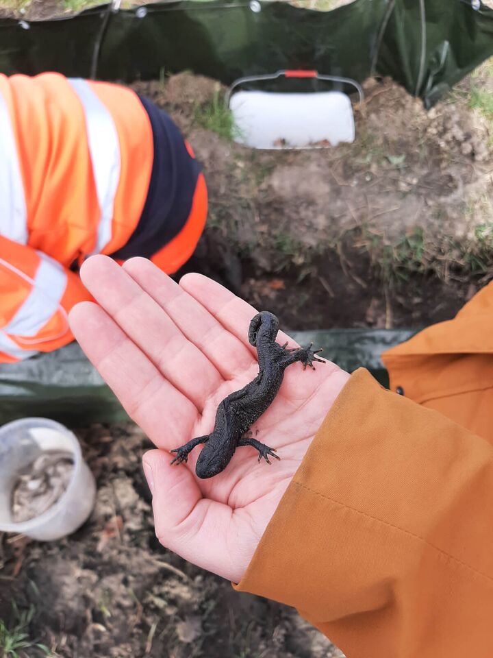 Innerhalb weniger Wochen wurden so bereits Tausende Amphibien, insbesondere Teich- und Kammmolche, die aus der Bahnböschung abwanderten, gerettet. Damit die Tierchen im nächsten Winter wieder ein sicheres Umfeld zum Überwintern finden, errichten wir bis August 2023 ausreichend frostsichere Winterverstecke. So ist sichergestellt, dass Kammmolch und Co. den nächsten Winter nicht im zukünftigen Baufeld verbringen und von den Bauarbeiten „überrumpelt“ werden.