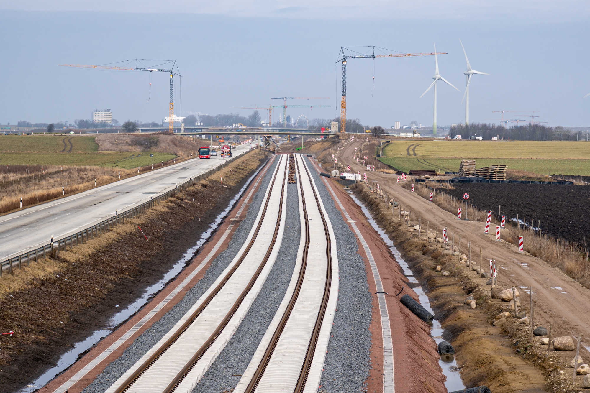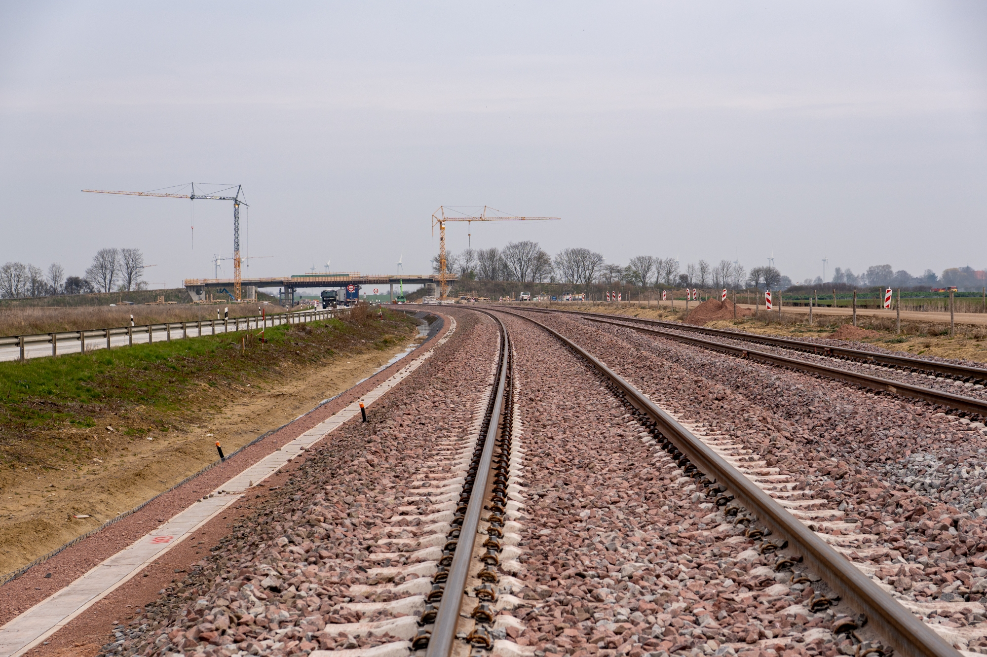 - Die bisher auf dem Grundschotter verlegten Gleise im Norden der Trasse (Anschluss Fehmarnbelt-Tunnel bis knapp 400 Meter südlich des Landkirchener Weg) verfüllen wir mit 14.000 bis 16.000 Tonnen zusätzlichem Schotter.