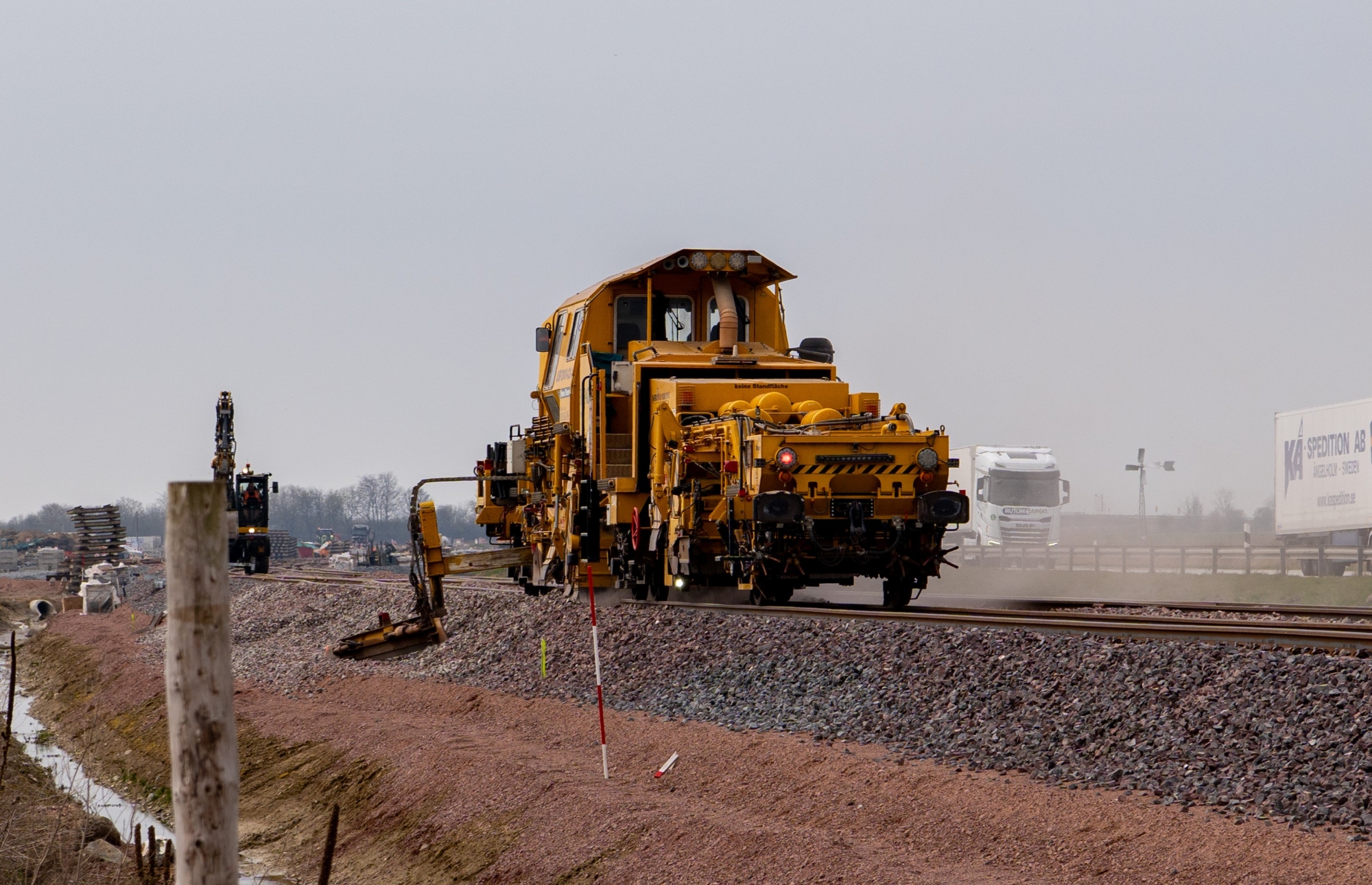 Seit Anfang April stehen auf unserer Baustelle auf Fehmarn die Schotterarbeiten im Fokus. Nachdem wir die neuen Gleise aus Schwellen, Langschienen und Weichen auf dem Grundschotter zusammengebaut haben, bedecken und verfüllen wir diese mit einer weiteren Schicht Schotter. Dieser wird über das Baugleis antransportiert und direkt an Ort und Stelle entlang der Tasse abgeladen. Seit letzter Woche kommt die Stopfmaschine zum Einsatz: Sie fährt Stück für Stück über das Gleis, hebt dieses dabei leicht an, richtet es final aus und verdichtet die darunter- und umliegende Schotterschicht. So liegt das neue Gleis auf stabilem Untergrund und ist in seiner Zielposition fest verankert. Im Video werfen wir einen Blick hinter die Kulissen:
