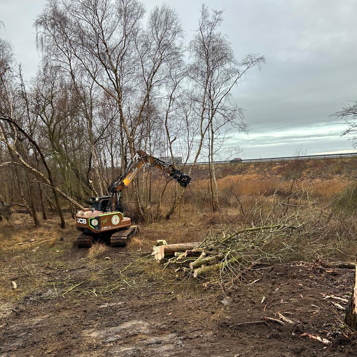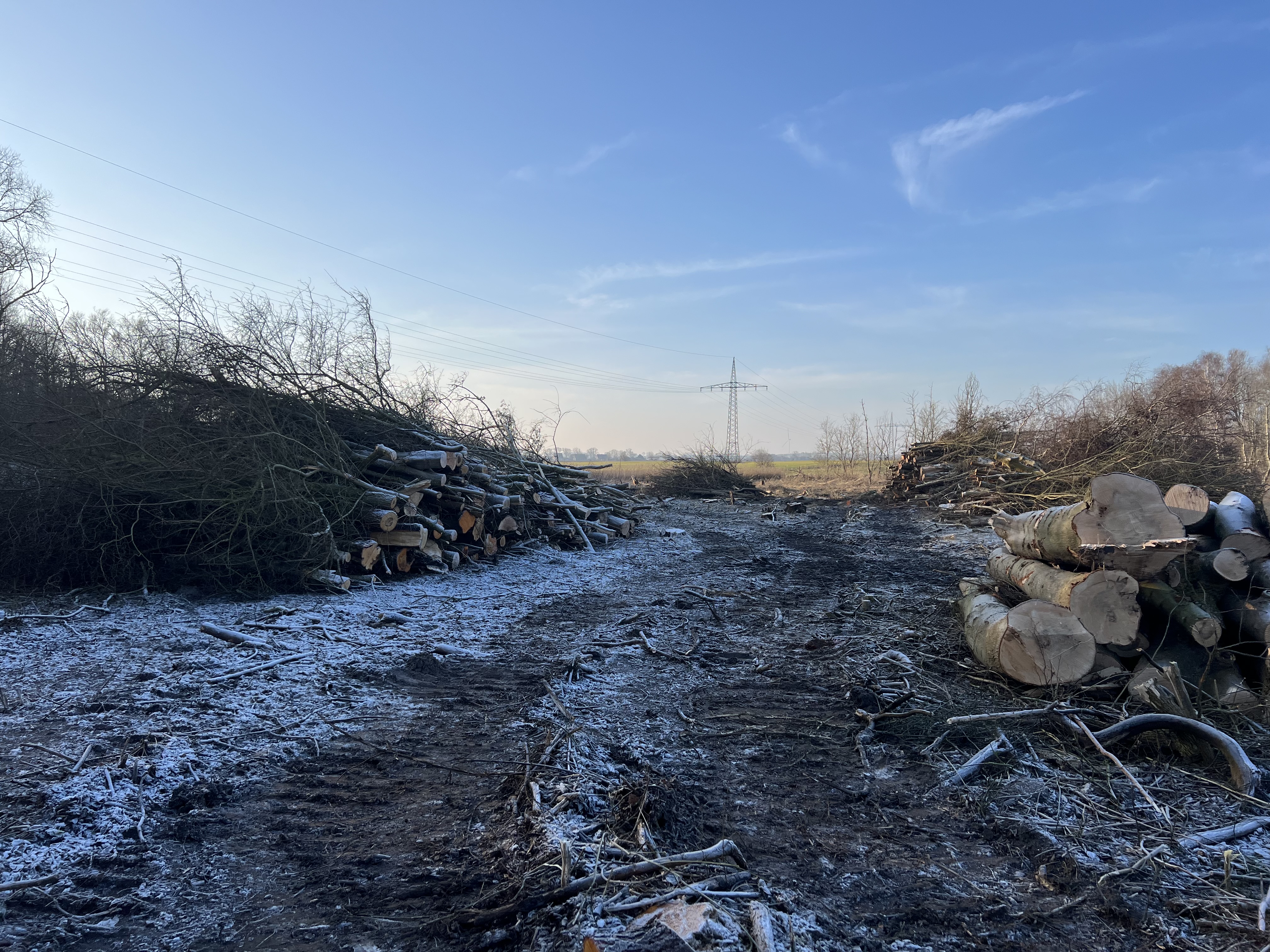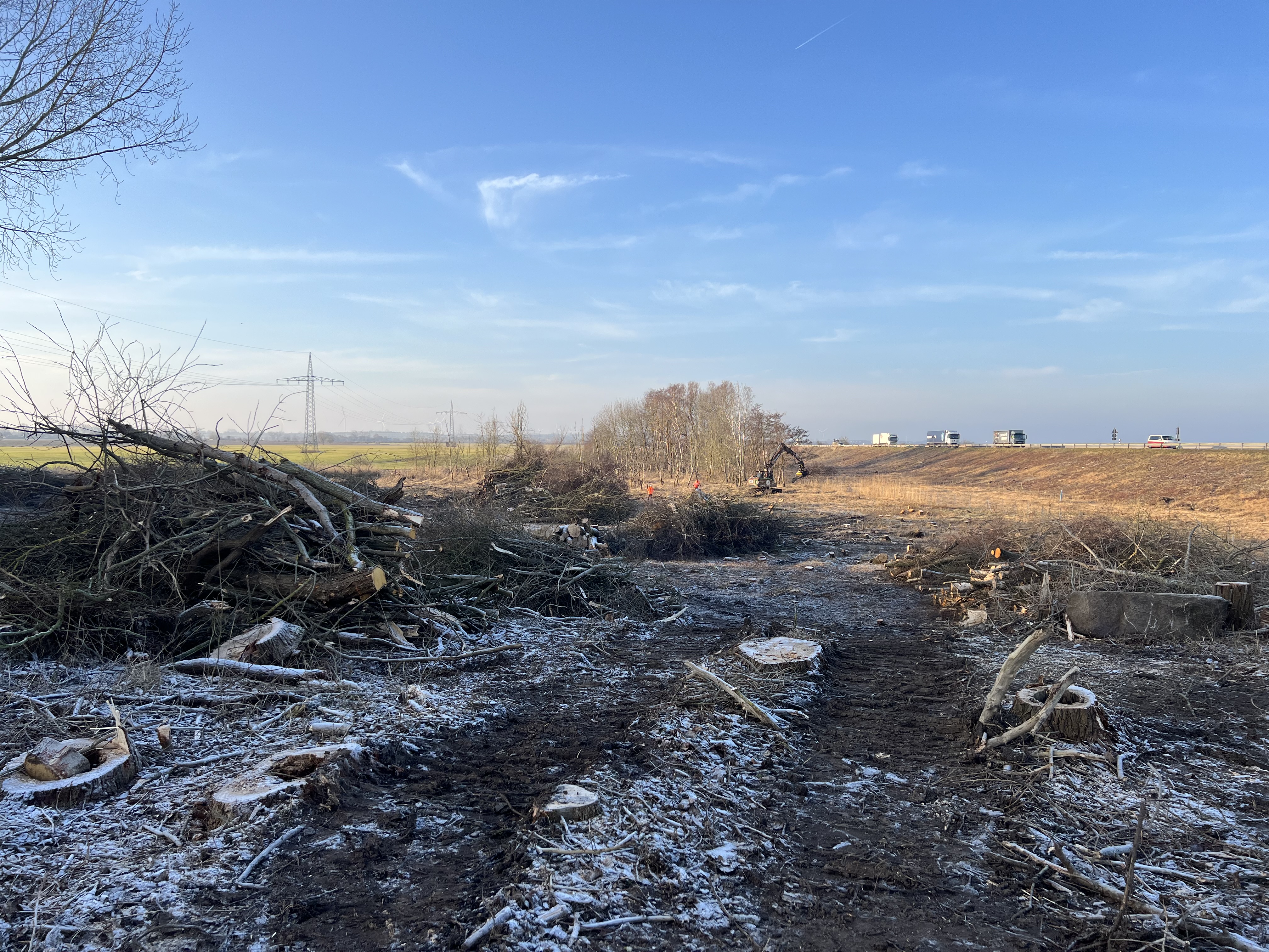 Die Rodungsarbeiten an der Großenbroder Aue schreiten gut voran: Seit Mitte Januar werden die Flächen, die für die DB-Baustelle und die neue Bahntrasse benötigt werden, frei gemacht. Dabei spielt uns die frostige Witterung in die Karten, denn ein gefrorener Boden ist mit Baumaschinen leichter zu befahren als matschige Wald- oder Feldwege und tieferliegende Bodenschichten werden geschont. Spätestens Ende Februar werden die Rodungsarbeiten unter Berücksichtigung der Vegetationsperiode beendet sein.