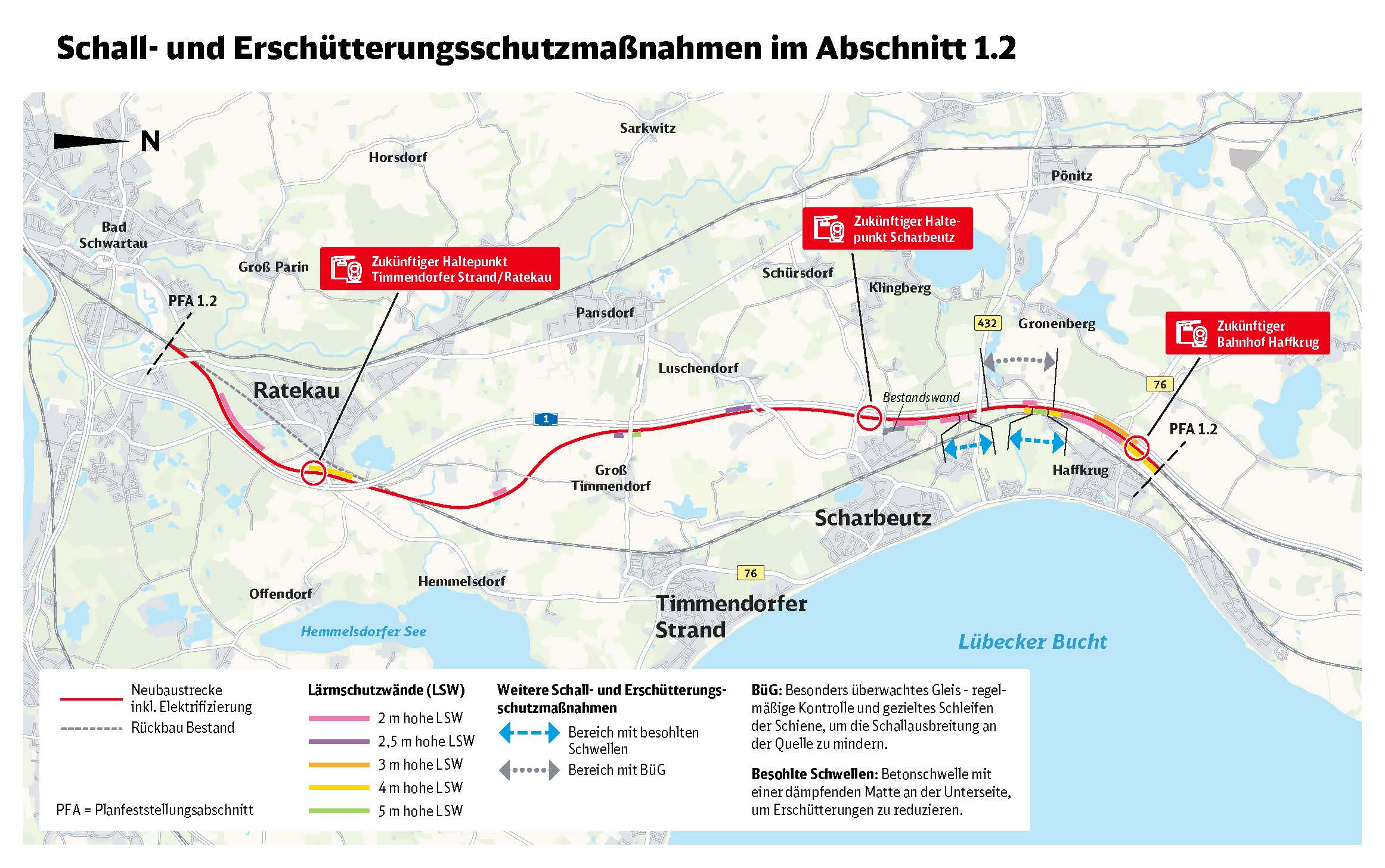 Der Abschnitt 1.2 umfasst die Gemeinden Ratekau, Timmendorfer Strand und Scharbeutz. In diesem Abschnitt weicht die Strecke nahezu vollständig von den bestehenden Gleisen ab. Aus Sorge vor künftigem Lärm durch Güterverkehre, wurde 2014 die Umfahrung der Bäderorte beschlossen. Der Neubau der Strecke orientiert sich daher am Verlauf der Autobahn A1. Daraus ergeben sich in diesem Abschnitt viele bauliche Anpassungen der Autobahnzufahrten und -abfahrten sowie der anschließenden Straßen. Zudem erhalten Ratekau und Timmendorfer Strand einen neuen gemeinsamen Haltepunkt im Bereich der Bäderstraße in Ratekau. Die Gemeinde Scharbeutz erhält im Bereich der Straße Bövelstredder einen neuen Haltepunkt, während in Haffkrug im Umfeld der Autobahn A1 ein neuer Bahnhof entsteht. Mit der Neubaustrecke sowie dem Bau der neuen Verkehrsstationen, den zahlreichen Eisenbahn-, Straßen- und Personenüberführungen erhält die touristische Region eine moderne und zukunftsfähige Infrastruktur.